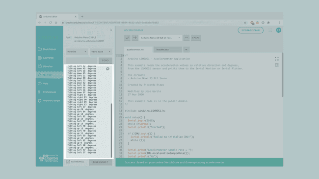 IMU.readAcceleration initialization, we add four if statements for the board's different positions. The statements will calculate the direction in which the board will be tilting towards, as well as provide the axe's degree values.1if(x > 0.1){2 x = 100*x;3 degreesX = map(x, 0, 97, 0, 90);4 Serial.print("Tilting up ");5 Serial.print(degreesX);6 Serial.println(" degrees");7 }8 if(x < -0.1){9 x = 100*x;10 degreesX = map(x, 0, -100, 0, 90);11 Serial.print("Tilting down ");12 Serial.print(degreesX);13 Serial.println(" degrees");14 }15 if(y > 0.1){16 y = 100*y;17 degreesY = map(y, 0, 97, 0, 90);18 Serial.print("Tilting left ");19 Serial.print(degreesY);20 Serial.println(" degrees");21 }22 if(y < -0.1){23 y = 100*y;24 degreesY = map(y, 0, -100, 0, 90);25 Serial.print("Tilting right ");26 Serial.print(degreesY);27 Serial.println(" degrees");28 }Lastly, we